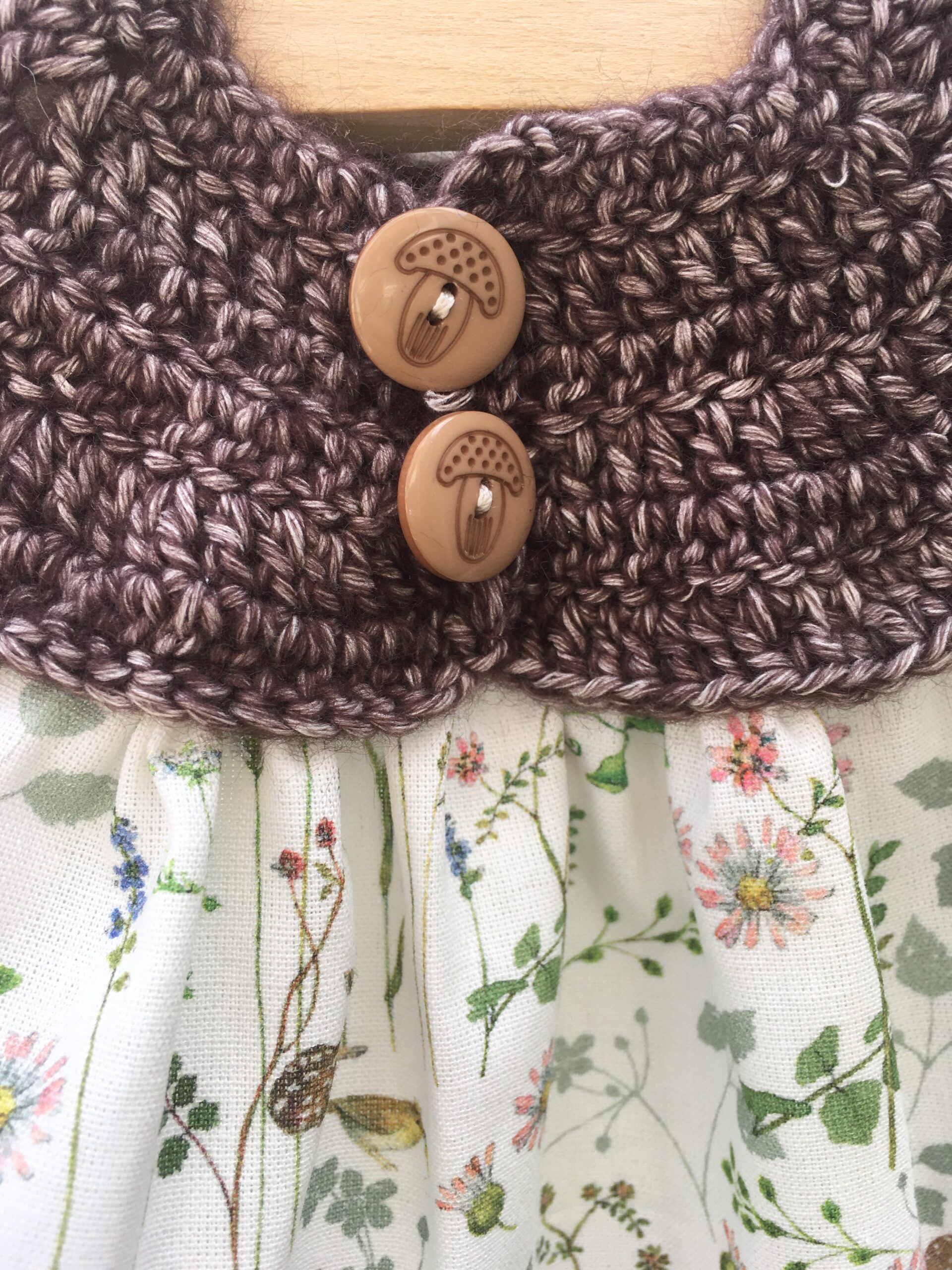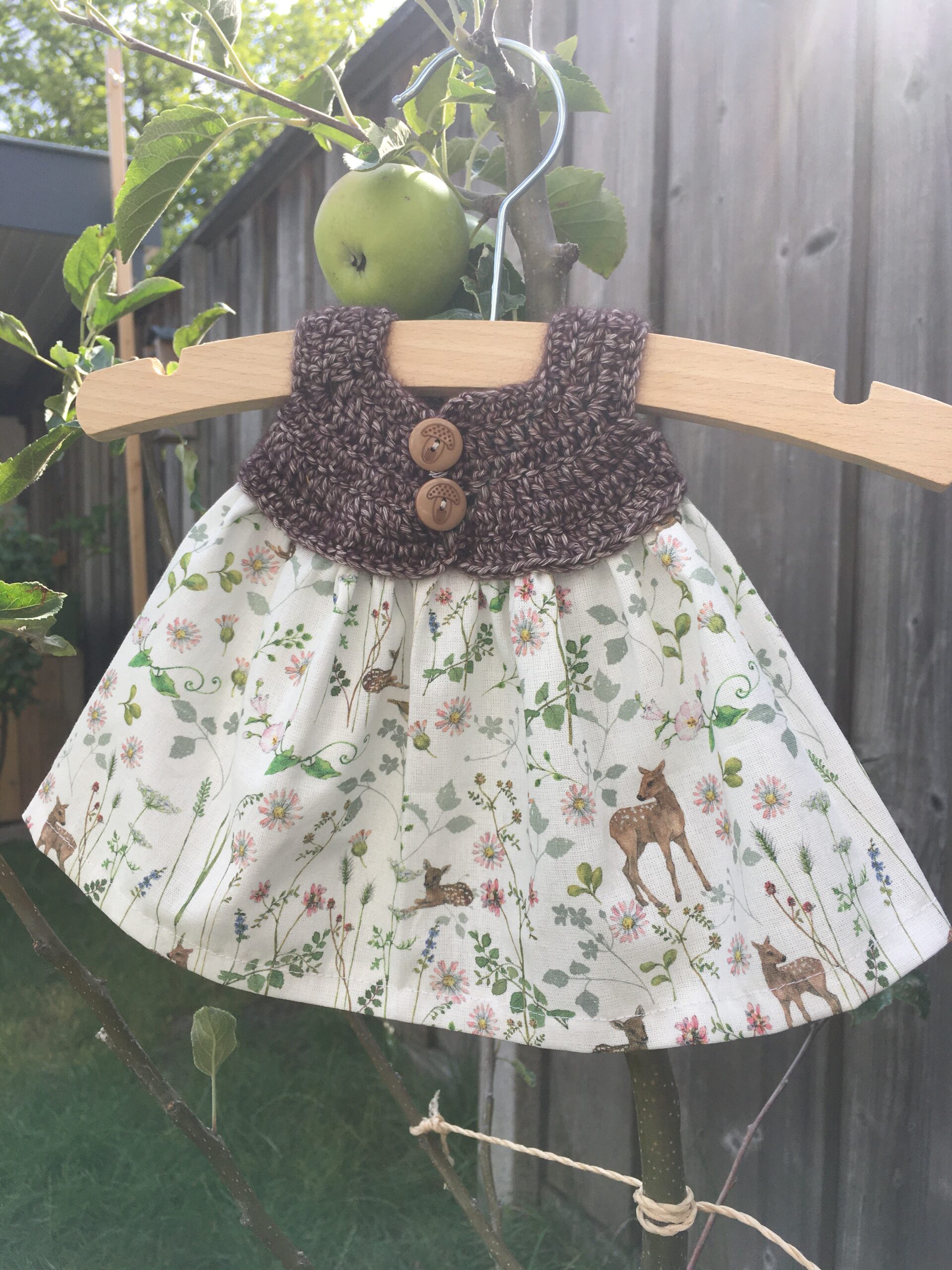 Dit jurkje is gemaakt voor poppen van 30 tot 35cm. Het bovenstuk is gehaakt van acrylgaren. Het onderstuk is gemaakt van hoogwaardig katoenstof met een oeko-tex keurmerk. Deze lieve stof met hertjes is ontworpen door Daniela Drescher.