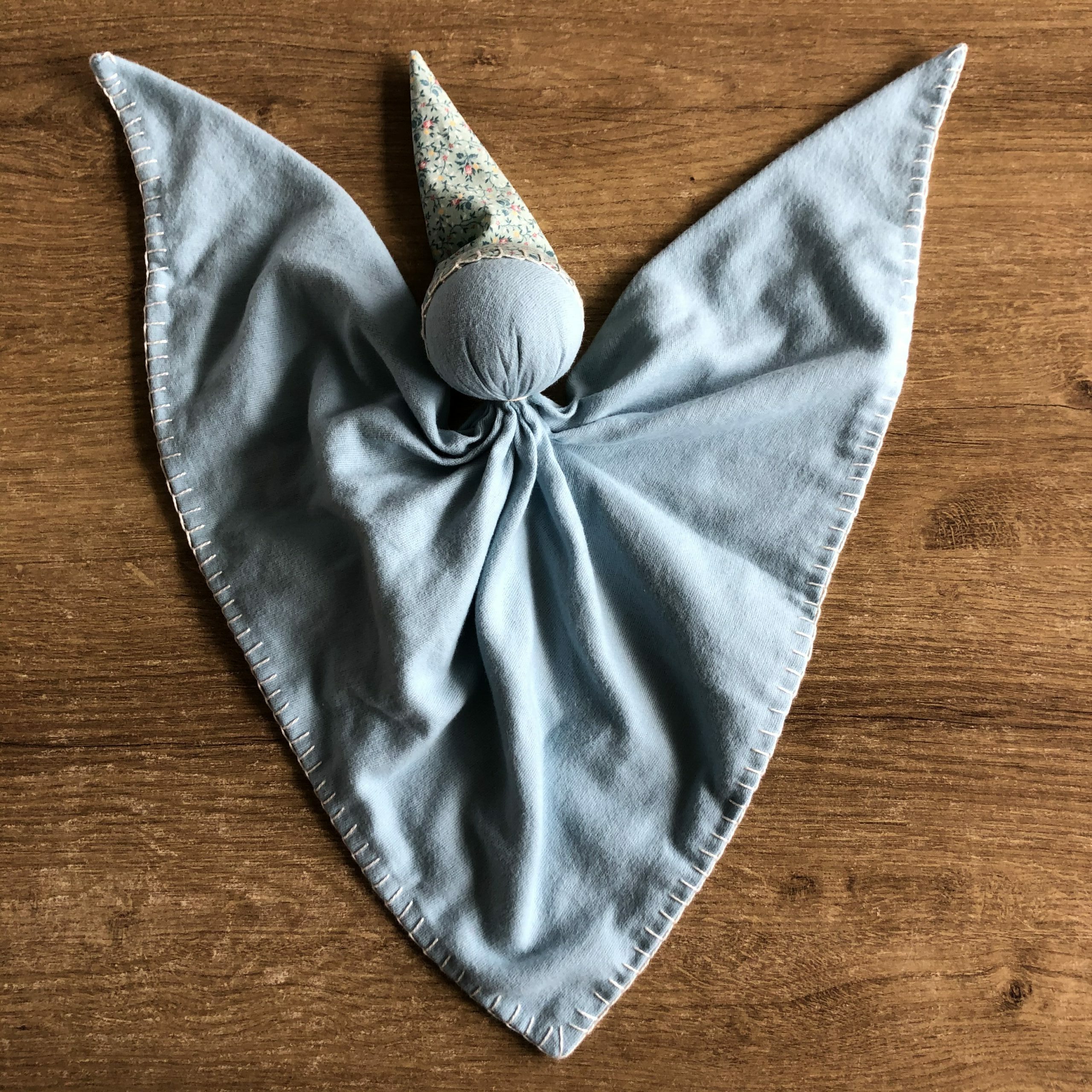 Zacht blauw poppelotje van zacht flanel, gevuld met biologische schapenwol. Ze heeft een mutsje met mooie bloemen gemaakt van katoen met een OEKO-TEX keurmerk. De randen zijn geborduurd met het duurzame DMC borduurgaren.