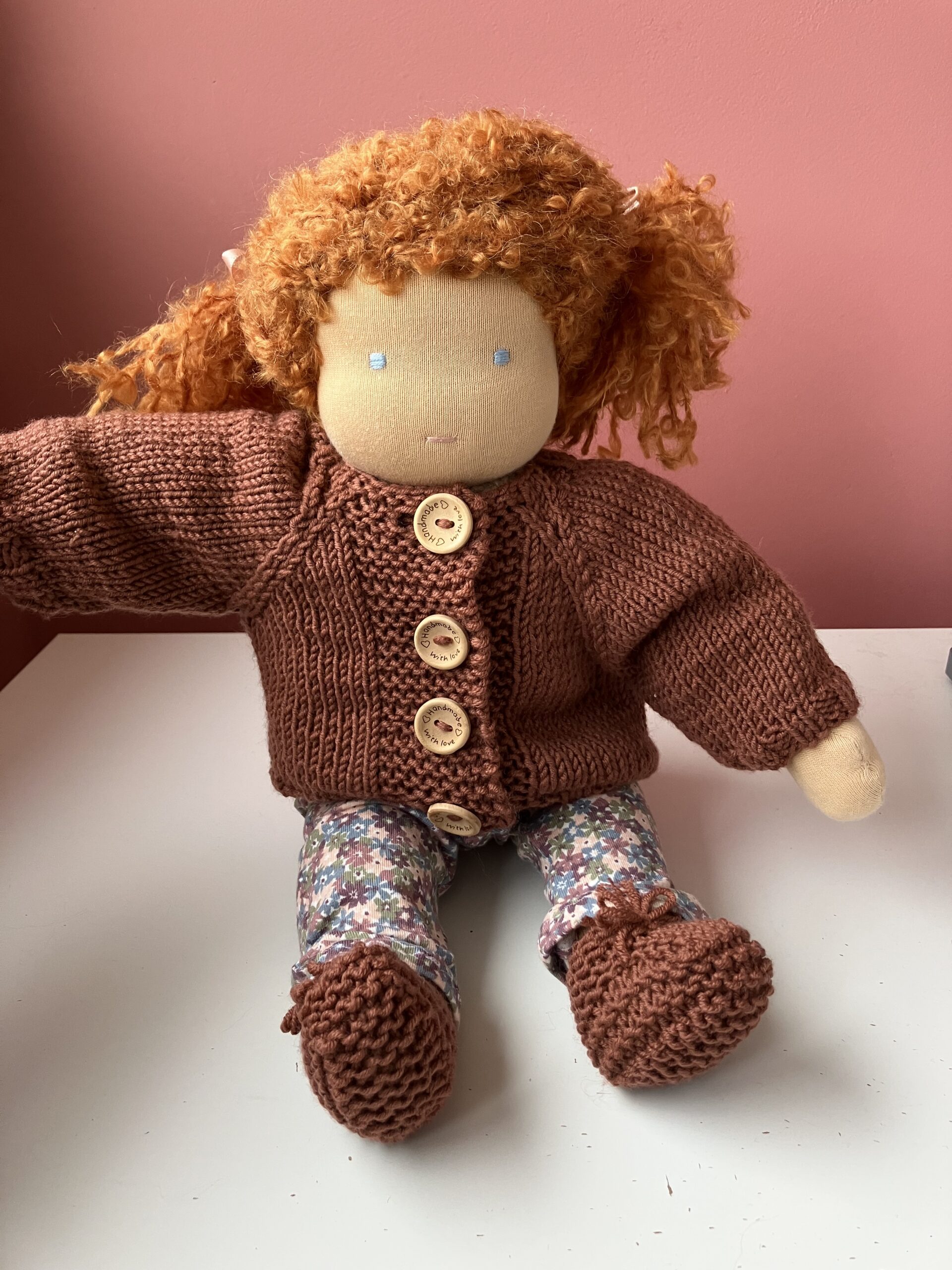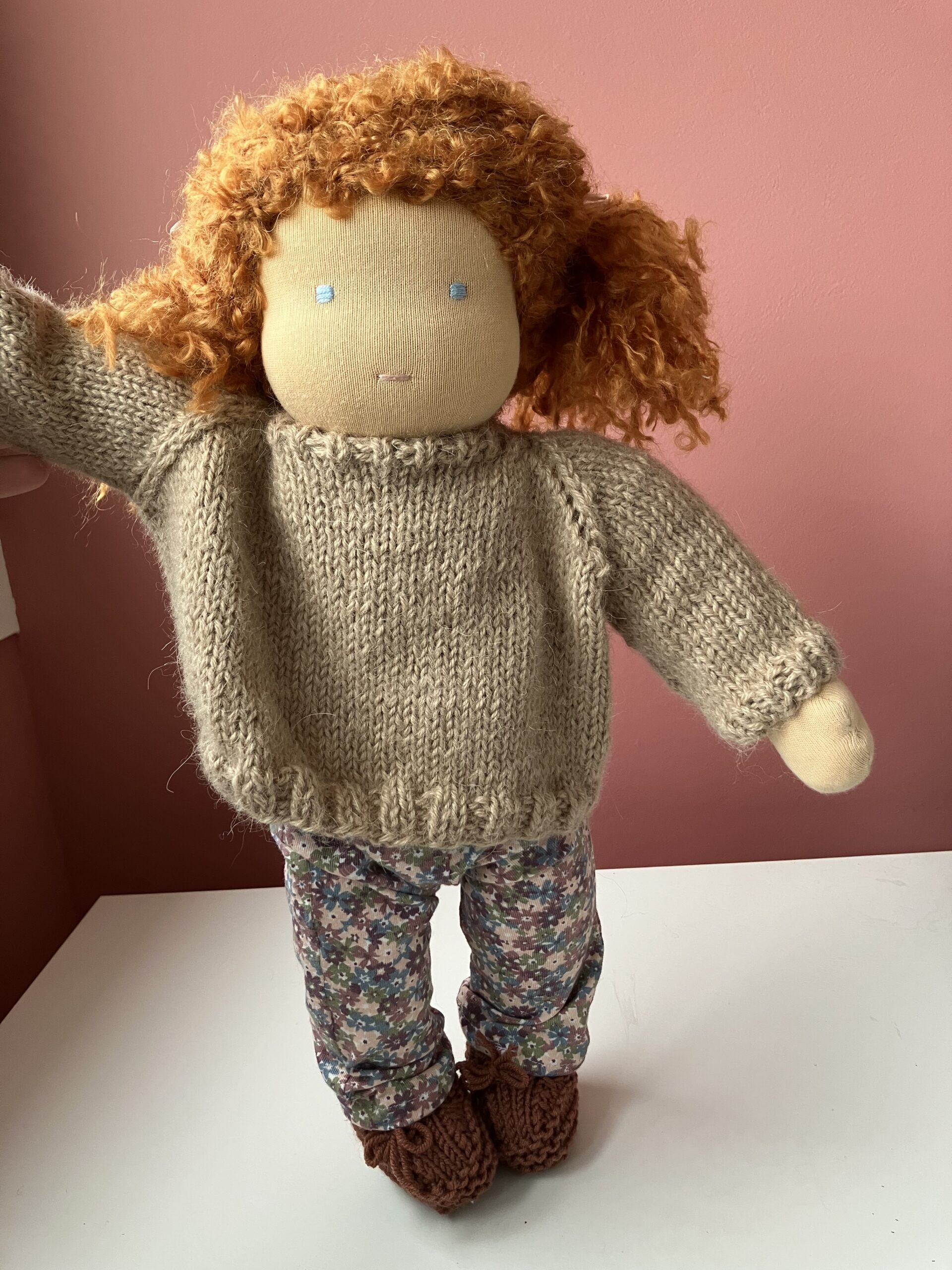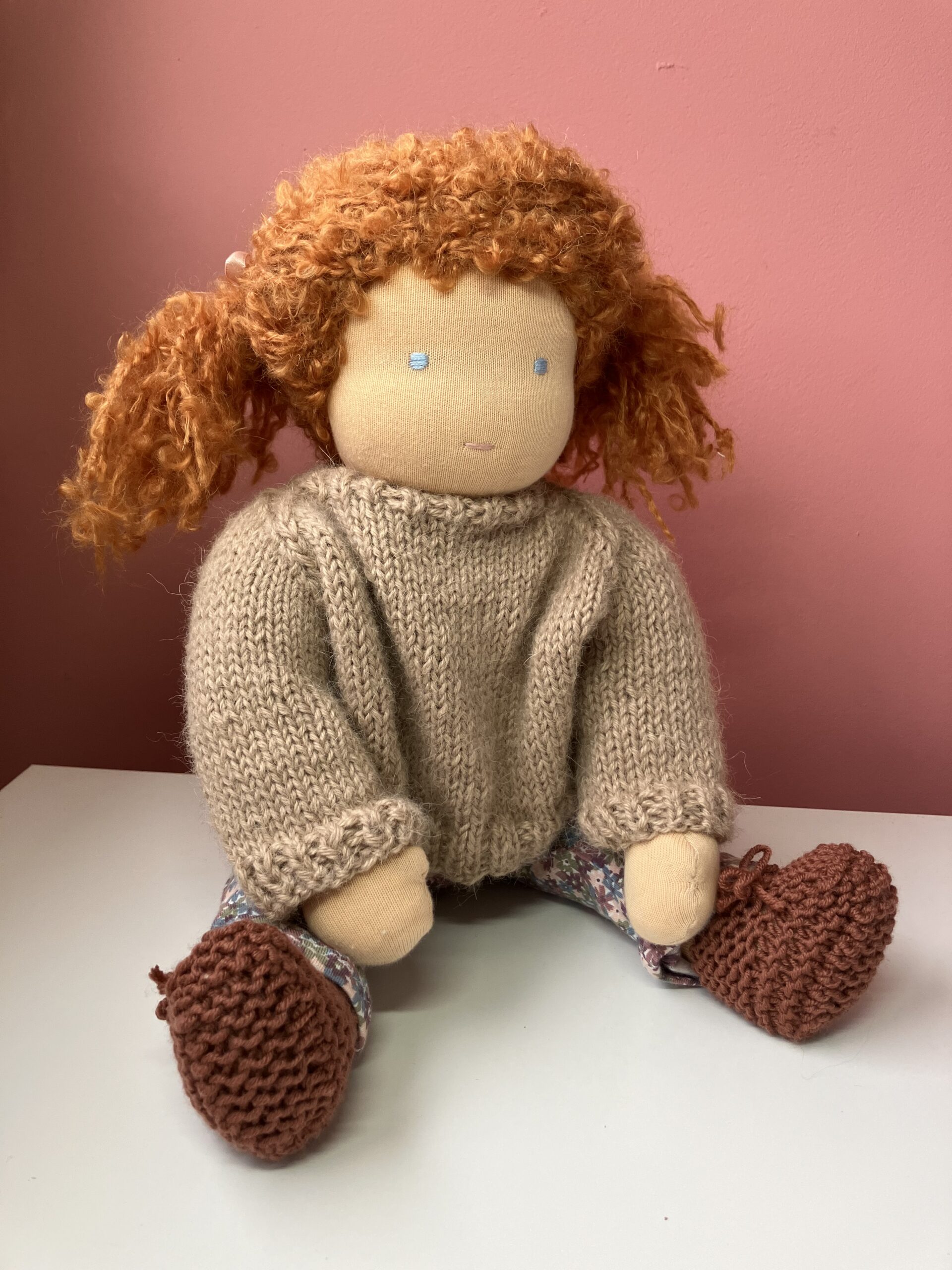 Zonnekindpop Marij is 43 cm lang. Haar vest en slofjes zijn gemaakt van 100% schapenwol. Haar truitje is gemaakt van 100% alpacawol. Ze heeft geborduurde oogjes en mondje van het prachtige DMC borduurgaren. Marij haar lijfje is gemaakt van Zwitserse tricot en gevuld met biologische schapenwol. Haar haartjes zijn gemaakt van Dolly mohair. Marij is volledig handgemaakt. Ook haar kleertjes zijn handgemaakt met duurzame garens.