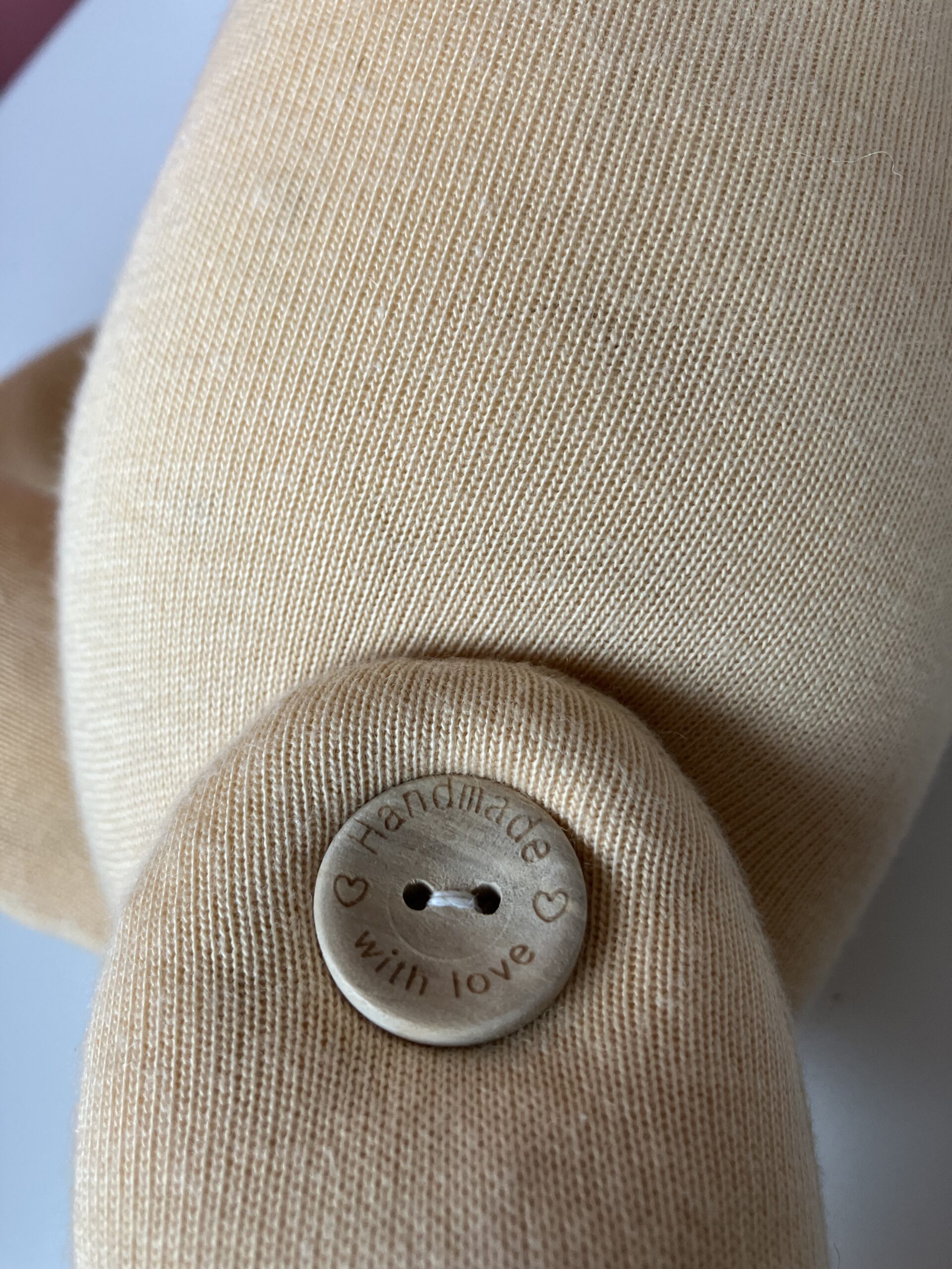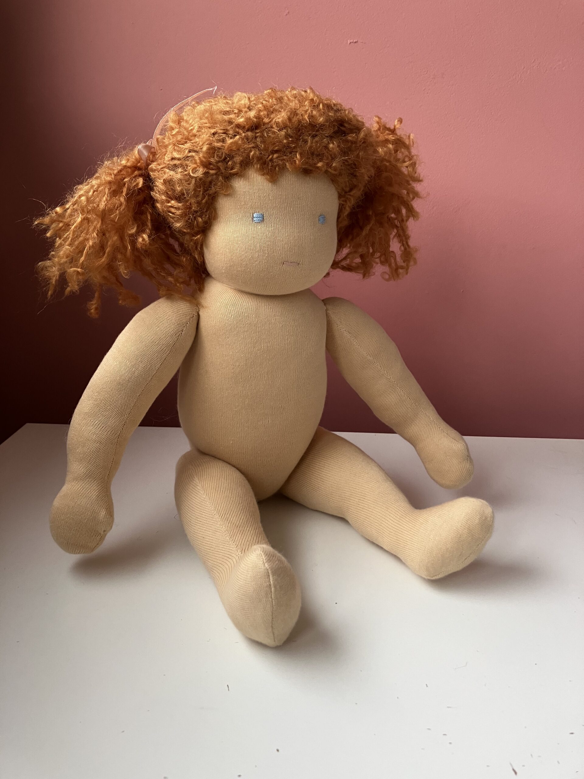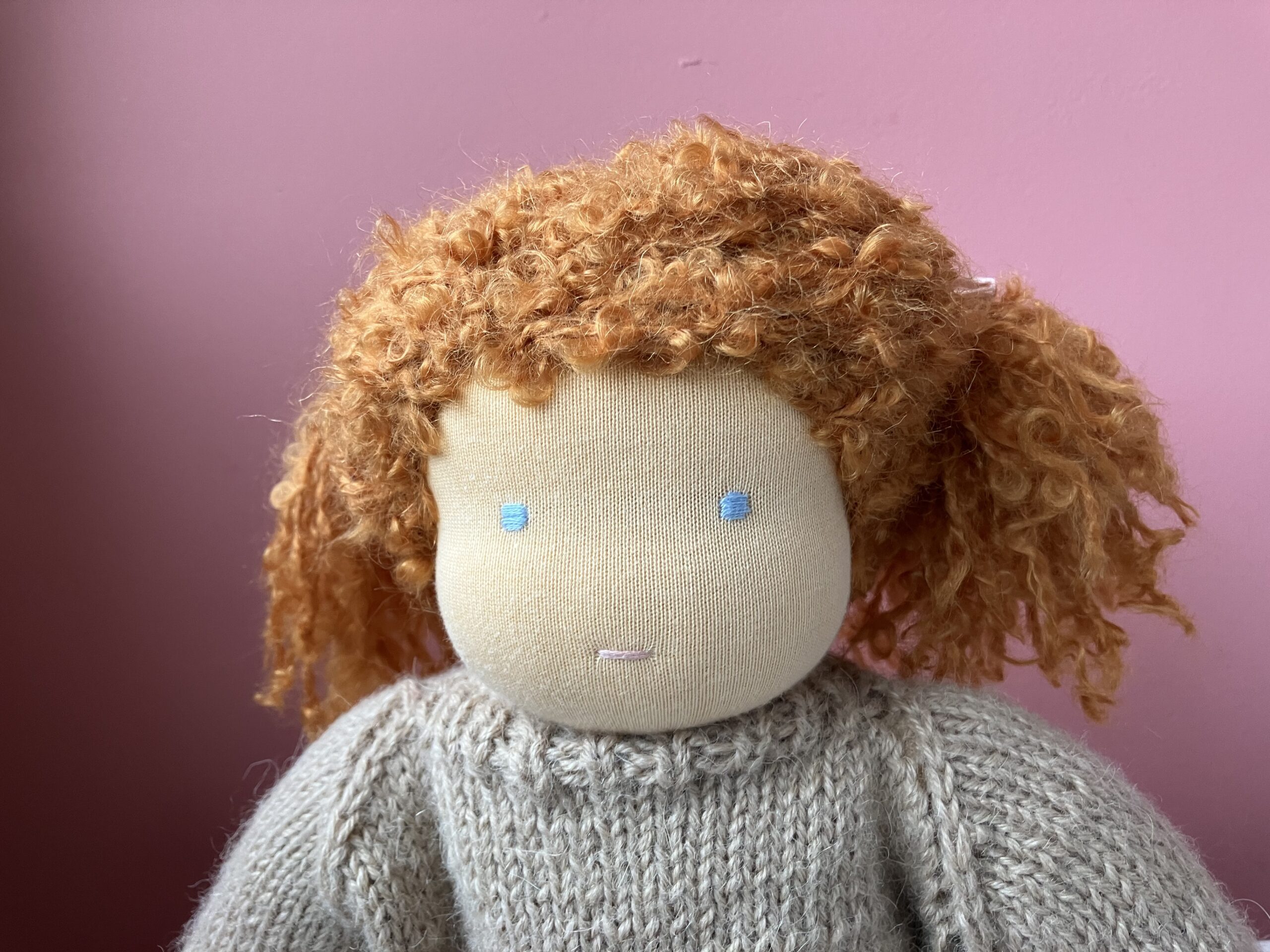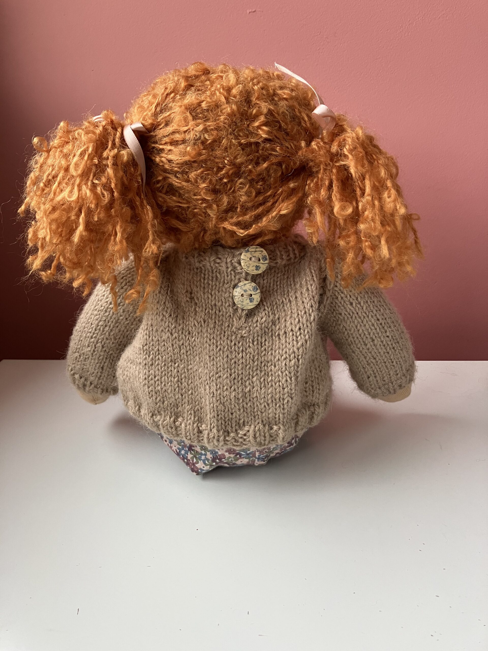 Zonnekindpop Marij is 43 cm lang. Haar vest en slofjes zijn gemaakt van 100% schapenwol. Haar truitje is gemaakt van 100% alpacawol. Ze heeft geborduurde oogjes en mondje van het prachtige DMC borduurgaren. Marij haar lijfje is gemaakt van Zwitserse tricot en gevuld met biologische schapenwol. Haar haartjes zijn gemaakt van Dolly mohair. Marij is volledig handgemaakt. Ook haar kleertjes zijn handgemaakt met duurzame garens.